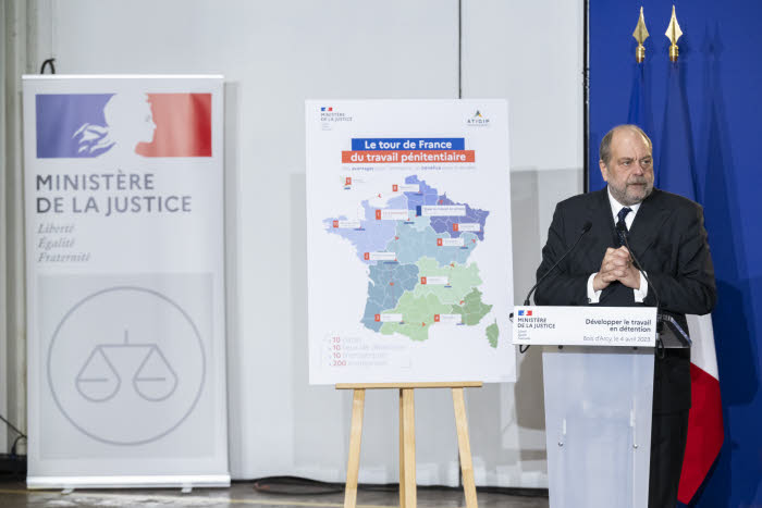 Le 4 avril dernier, Éric Dupond-Moretti, garde des Sceaux, ministre de la Justice s'est rendu au centre pénitentiaire de Bois d'Arcy, en présence d'une soixantaine de chefs d'entreprise (TPE, PME, grandes entreprises appartenant au CAC 40), de structures d'insertion par l'activité économique, d'associations d'insertion, et d'aides aux victimes, afin de visiter un des 600 ateliers pénitentiaires, et présenter aux sociétés et partenaires le travail en détention.
